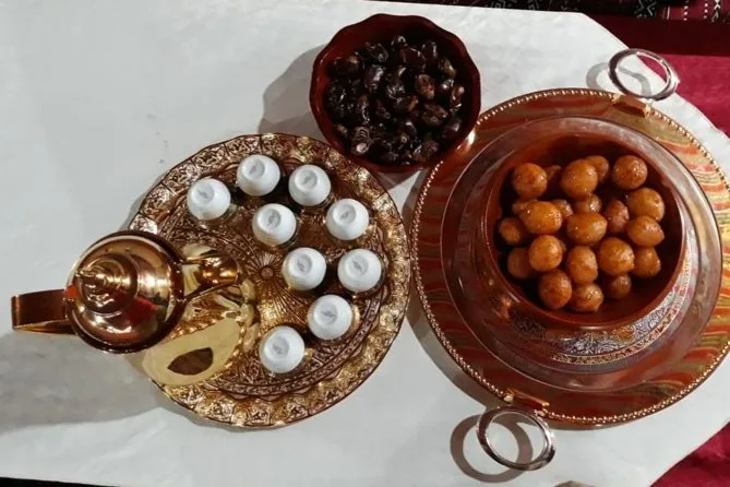 Dune bashing in Lehbab desert, sandboarding, camel ride, photo with falcon (in winter), Arabic sweets and coffee.