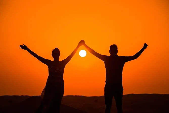 Your day includes pickup and drop-off from your hotel by licensed driver in an air-conditioned 4WD vehicle; all dune bashing activities; sandboarding; unlimited water and soft drinks; Arabic coffee (qahwa), dates and gaymat sweets on arrival; short camel rides (repeatable); falcon experience with photos; henna painting for ladies; shisha pipe in designated area; access to all live shows including Yola dance, falconry display, mega fire show; a full open buffet BBQ dinner with vegetarian options; plus an evening stargazing session led by guides before returning to your accommodation.
