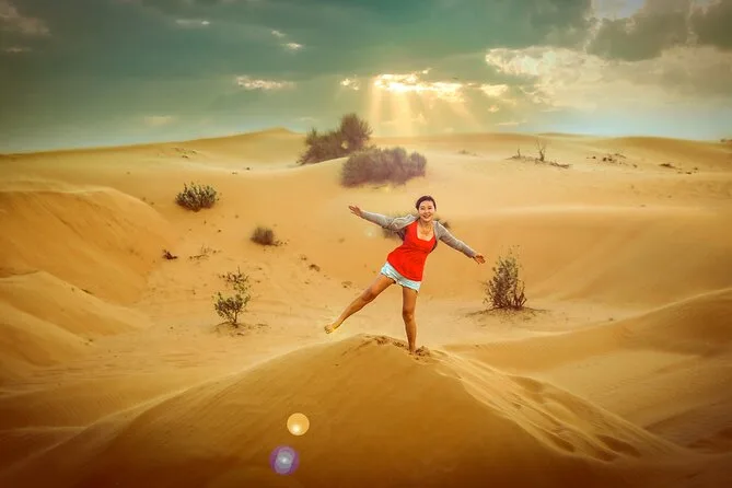 Ever wonder what it feels like when the sand under your shoes actually squeaks? That’s the first thing I noticed stepping out of the 4WD into the Lahbab desert — that and how the air felt warmer than I’d expected, even as the sun started dipping. Our driver, Kareem, grinned at us in the mirror before taking off across those red dunes. I’m not really a thrill-seeker (my sister is), but dune bashing was… well, let’s just say my stomach didn’t love it but my laughter surprised me. Sand everywhere — in my shoes, hair, probably still finding it weeks later.