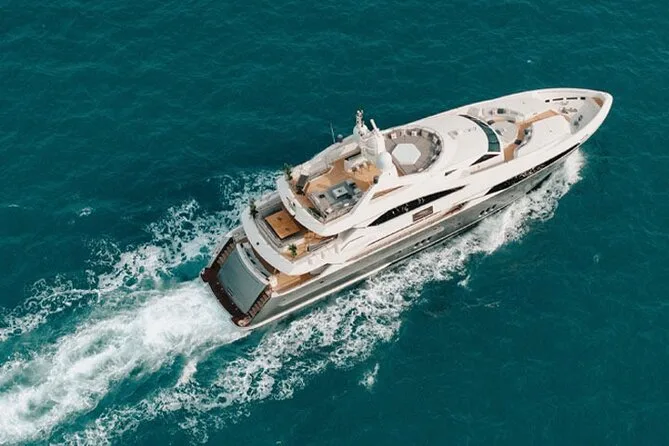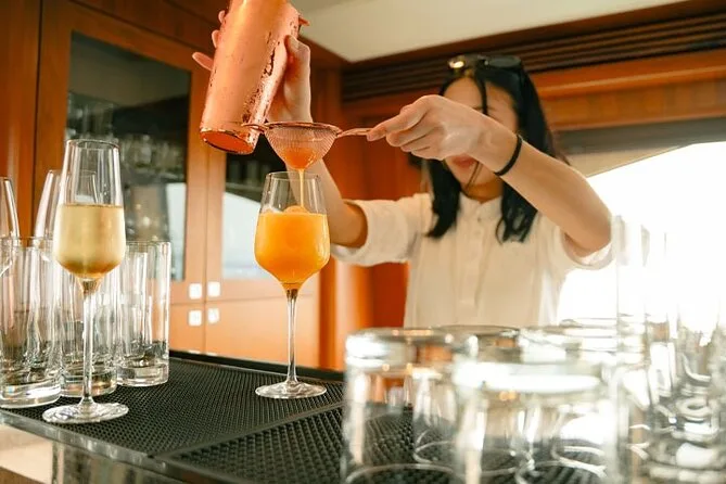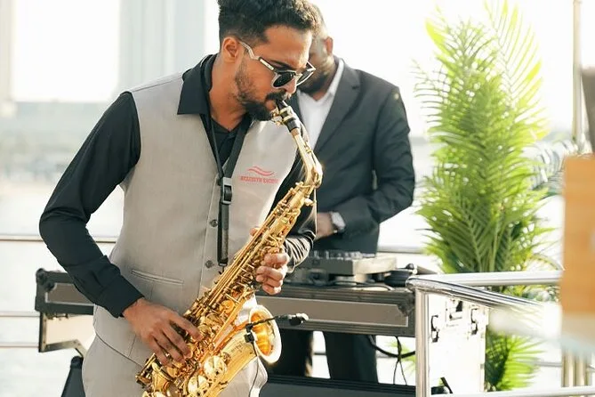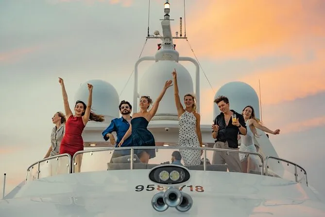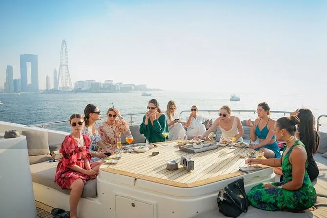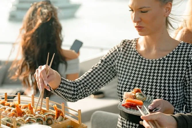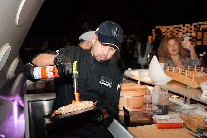 You’ll step barefoot onto a tri-deck Sunseeker yacht in Dubai Harbour for an evening of omakase sushi, free-flowing drinks, live DJ music and city lights drifting by. Watch iconic landmarks like Burj Al Arab and Palm Jumeirah slip past as you taste each new dish — sometimes laughing with strangers, sometimes just lost in the view.