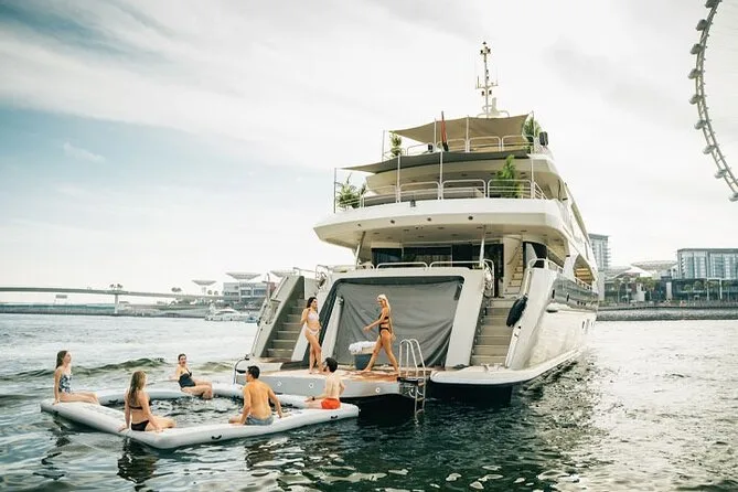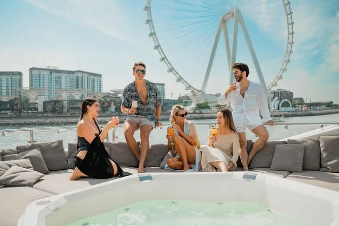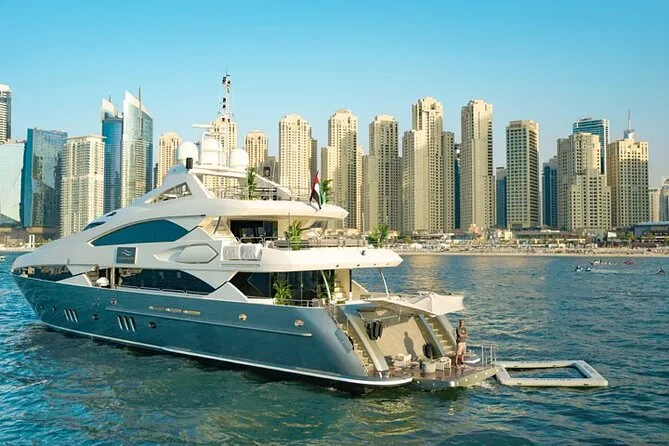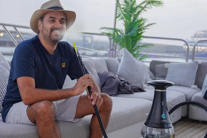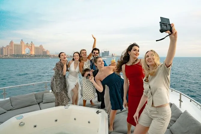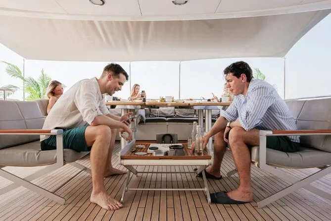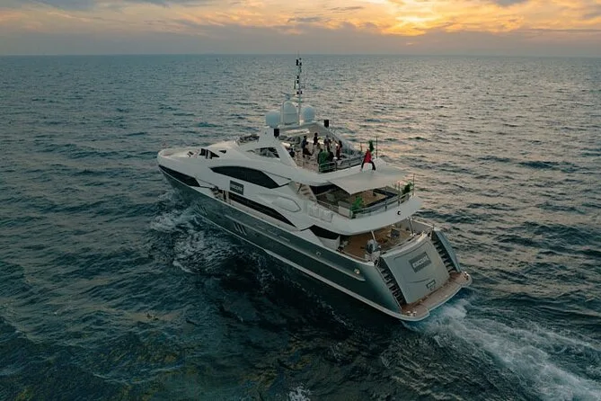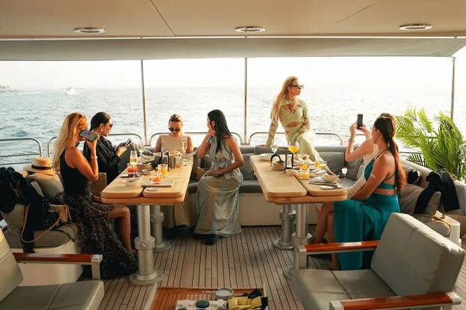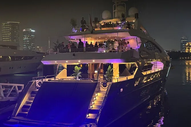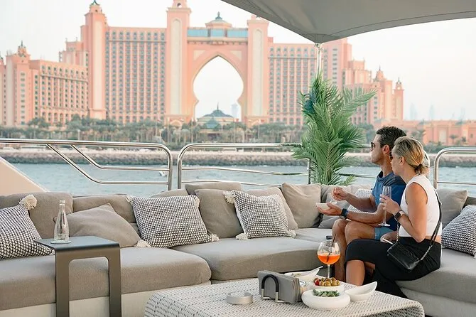Your evening includes three hours aboard a luxury Sunseeker superyacht with premium drinks and cocktails flowing freely, an evolving omakase sushi menu prepared by a master chef, gourmet bites throughout, electric shisha if you want it, towels and slippers provided (since shoes stay off), plus live DJ music as you drift past Dubai’s most famous landmarks like Burj Al Arab and Palm Jumeirah.