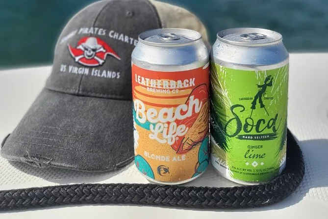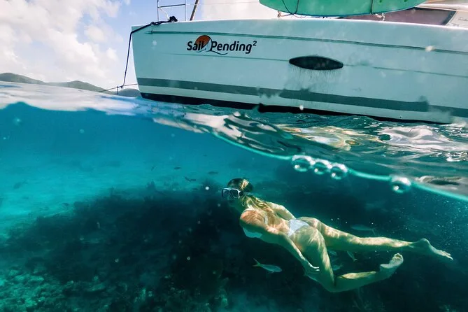Your day includes sailing on a semi-private catamaran with Coast Guard certified local crew members guiding you across Pillsbury Sound from St. Thomas; use of snorkeling gear; cheese or pepperoni pizza lunch delivered by Pizza Pi's boat; open bar with light snacks; champagne toast at sunset; restroom facilities onboard; plus all captain and fuel costs covered before returning in the evening.