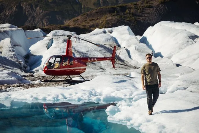 You’ll fly by helicopter from Girdwood over Alaska’s Chugach Mountains before landing right on a glacier for a guided walk with your pilot. Expect wild mountain views, blue meltwater pools on the ice, and stories from someone who knows these valleys well. It’s not just scenery — it’s stepping onto ancient ice and feeling what makes Alaska so raw and real.