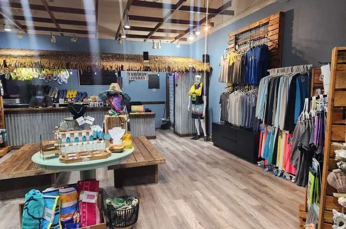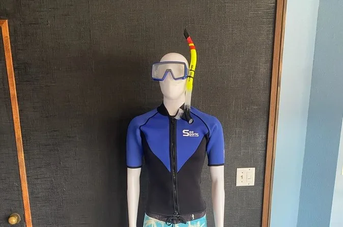 A short sleeve wetsuit top, mask, snorkel (no fins), and a flotation board are provided; snorkel vests are available for children 12 and under.