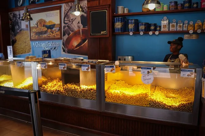 Your day includes guided walks through downtown Chicago’s Loop district with stops for deep dish pizza with sausage, an Italian beef sandwich dripping with jus, classic Chicago-style hot dog, gourmet popcorn from a local spot, rich fudgy brownie at Palmer House Hilton—and one delicious secret dish revealed during your visit.