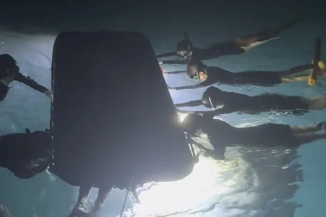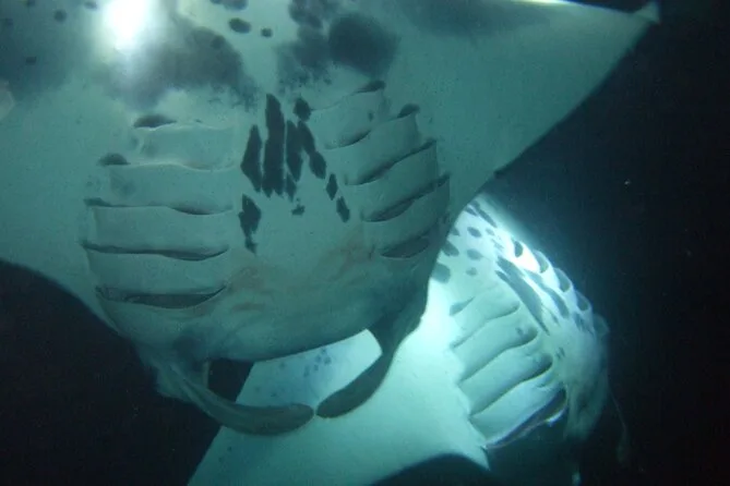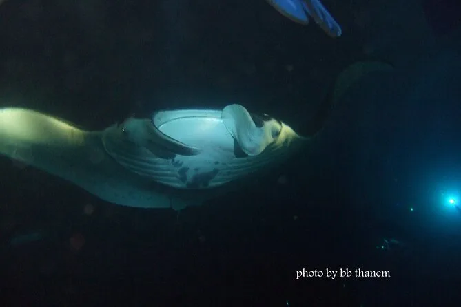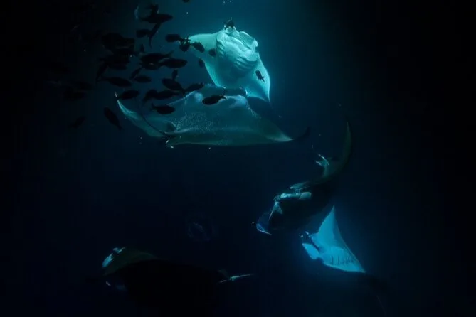 Once we were out past the lights of Kona, our guide handed out snorkel gear and Rx masks for those who needed them (I did, and honestly, being able to see clearly made all the difference). We slid into the water one by one — that first shock of coolness hits you right through the wetsuit — then grabbed onto this floating bar attached to a big raft. The LED lights below started glowing, drawing in swirls of plankton. It’s weird: you’re just lying there, face down, holding on while these ghostly shapes start circling underneath. When the first manta ray swooped up from below, its wings nearly brushing my fins, I think my heart actually stopped for a second.