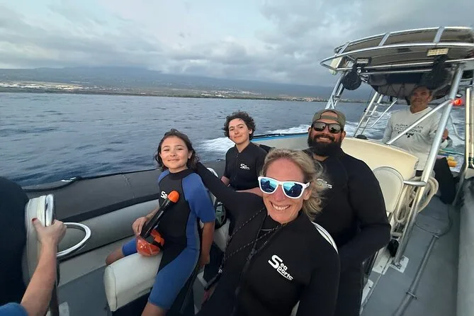Your evening includes check-in at Honokohau Harbor where you’ll get fitted with a wetsuit (no extra charge), full snorkel gear including flotation devices and optional Rx masks by request. Island juices, soda, bottled water and light snacks are served after your swim before heading back to shore with your small group.