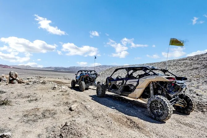 Your day includes hotel pickup and drop-off from Las Vegas hotels, use of top-of-the-line side-by-side UTVs on private trails through Yellow Pine Mine district, full-face fresh air pumping helmets with intercoms so you can talk to friends or your guide while driving, complimentary chilled bottled water plus coffee or hot chocolate at base camp before or after your ride—and time for photos at scenic stops along the way.