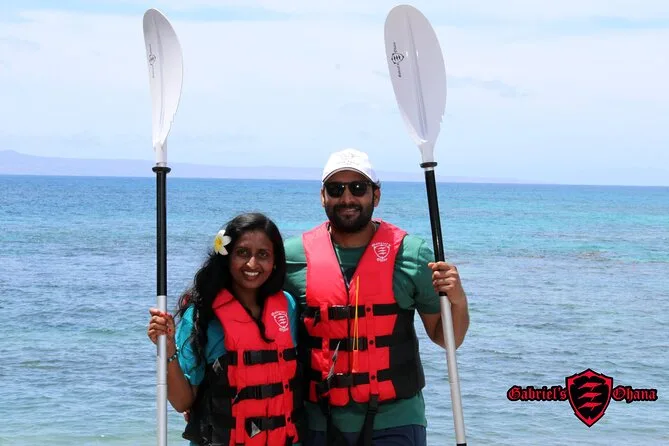 Your day includes use of newly manufactured clear kayaks with pontoon stabilizers, long-sleeve rash guards for sun protection, reef-safe sunscreen applied before heading out, dry bags for your belongings, locally grown bananas and granola while on the water plus ice-cold filtered water throughout—and when you return to shore there’s freshly cut Hawaiian pineapple dusted with li hing mui powder waiting for you.