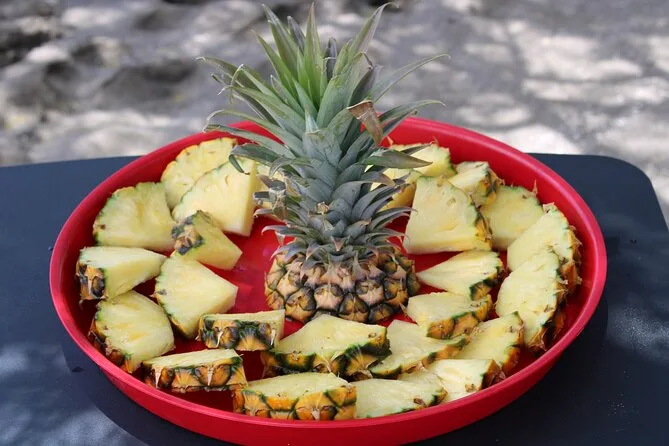 The tour includes rash guards, reef-safe sunscreen, dry bags, snacks (bananas/granola), water, and fresh pineapple after paddling.