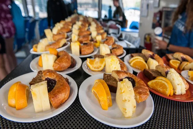 Yes, continental breakfast (banana bread, pastries, fruit) and BBQ lunch are included along with drinks like sodas and tropical juices.