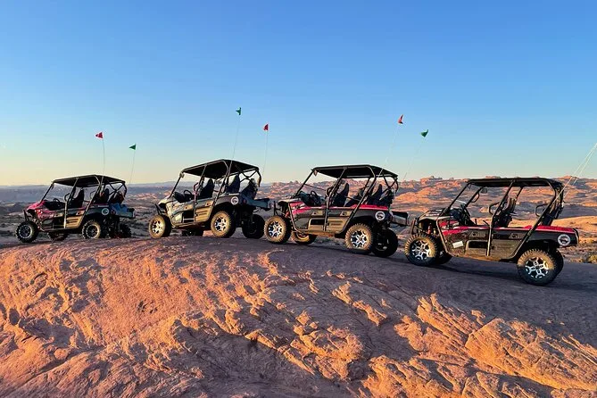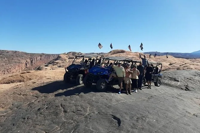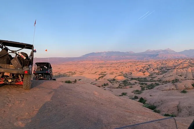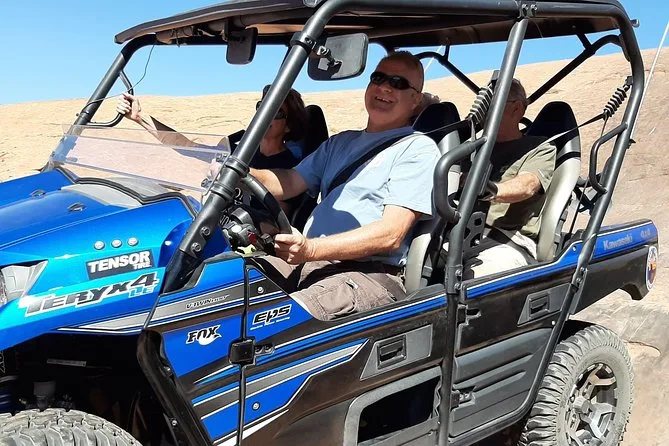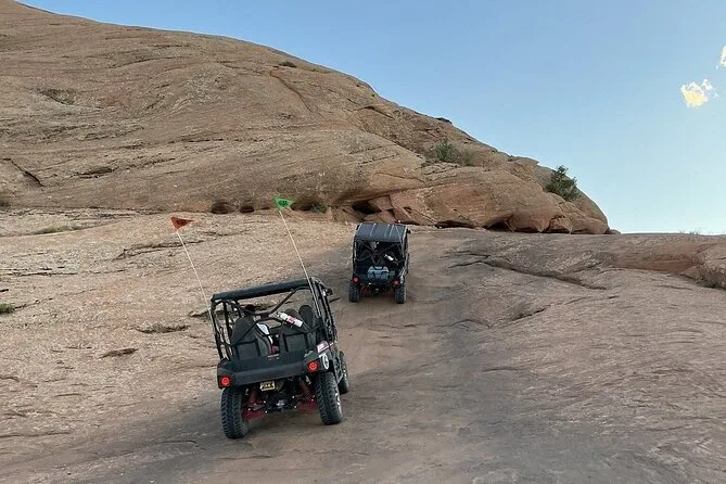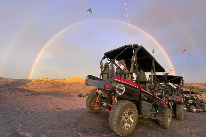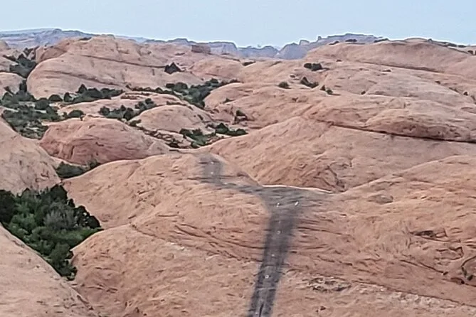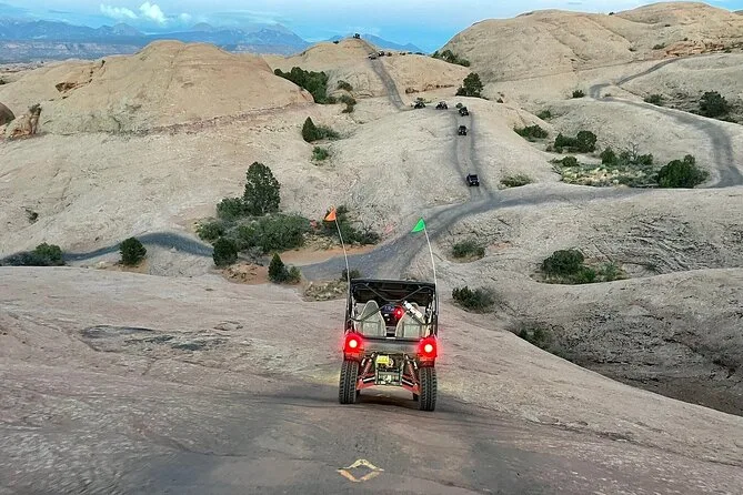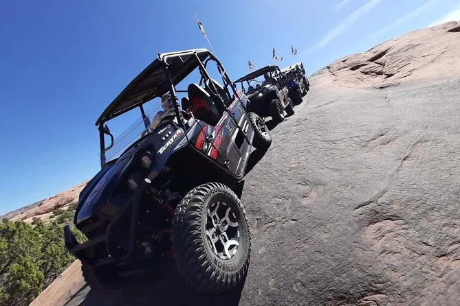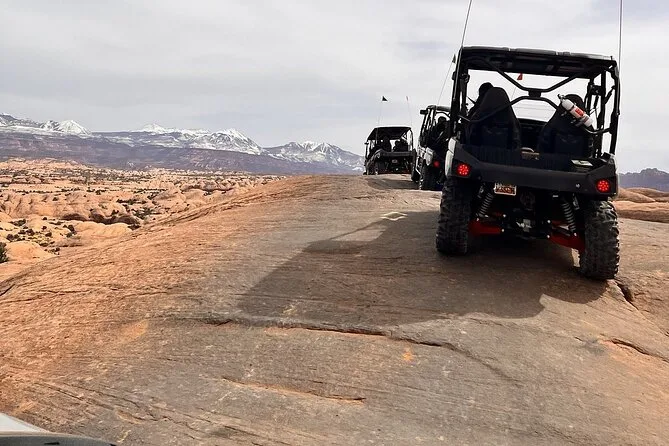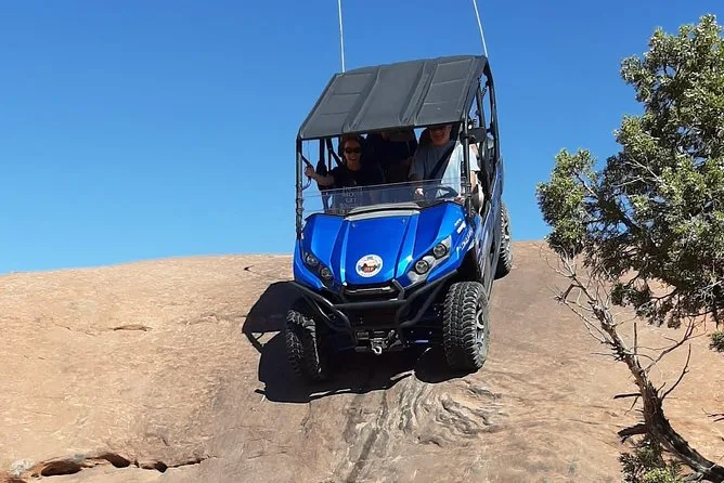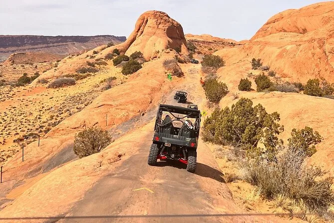 Your day includes use of your own 4-passenger vehicle on Hell’s Revenge trail with all fees and taxes covered, plus snacks like Rice Krispy Treats and bottled water along the route—your local guide leads the way as you explore Moab’s wildest slickrock terrain together.