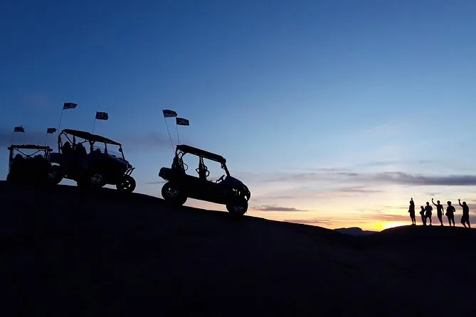 After the overlook, things got sandy — literally. The UTV slid around these loose curves that made my stomach drop (in a good way). Then came Hells Gate. We watched some pros tackle it while Jake explained how locals come out just to see if anyone tips over (nobody did today). The Hot Tubs section looked impossible but somehow wasn’t; I scraped the side mirror once but Jake didn’t seem bothered. Sun was starting to dip behind those petrified dunes by then, everything turning gold and pinkish-orange.