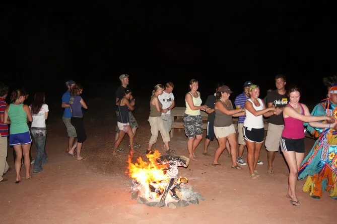 Your evening includes travel through Monument Valley by open-air vehicle or van (weather depending), bottled water throughout your journey, a live entertainment program after dark with traditional drumming and storytelling by the campfire, plus a full traditional Navajo dinner with drinks served right near Rain God Mesa before heading back out under those desert stars.