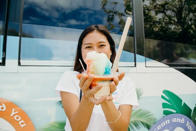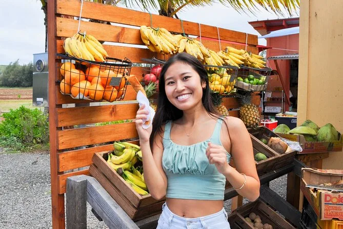 You’ll sample Kona coffee and macadamia nuts at Tropical Farms plus banana lumpia at Kahuku Land Farm.
