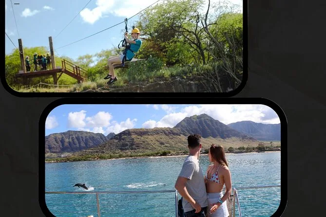 Your day includes three ziplines at Coral Crater Adventure Park with all safety gear provided, followed by a dolphin watching cruise from Ko Olina Marina where you’ll get use of snorkeling equipment and enjoy a full Hawaiian-style buffet lunch before returning to shore; optional pickup from Waikiki makes things easy if you’re staying in town.