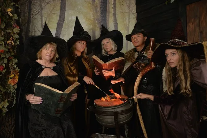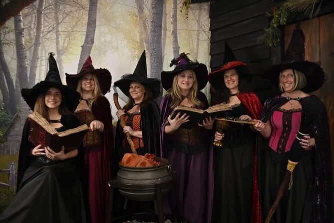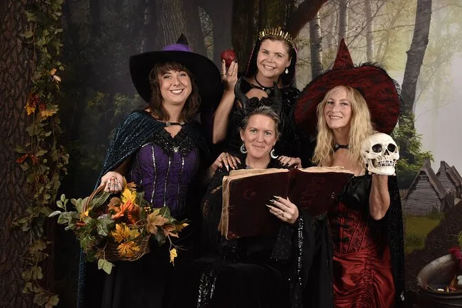 Your booking covers personal styling from an expert who helps each guest choose from hundreds of costumes (all sizes), one full witch or wizard outfit per person—including robe or dress, cape, and hat—a guided photo session with a professional photographer on the theatrical Olde Salem Village set complete with cauldron and cottage backdrop, plus digital images delivered after your private reveal session.
