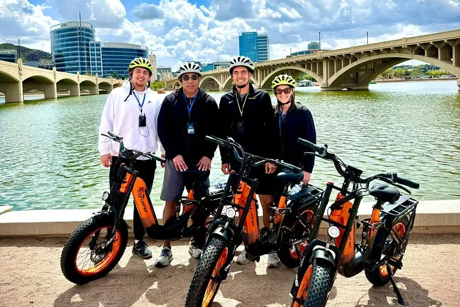 Your day includes bottled water for every rider, use of an easy-to-ride Cyrusher Kommoda fat tire electric bike (with absolutely no pedaling required), helmet rental for safety peace of mind, an advanced audio system so you can hear your guide even when spaced out along the trail, plus a private training period before setting off together—and if you need transport from your hotel or another spot nearby in Scottsdale or Tempe just call ahead so they can arrange pickup for you before your adventure begins.