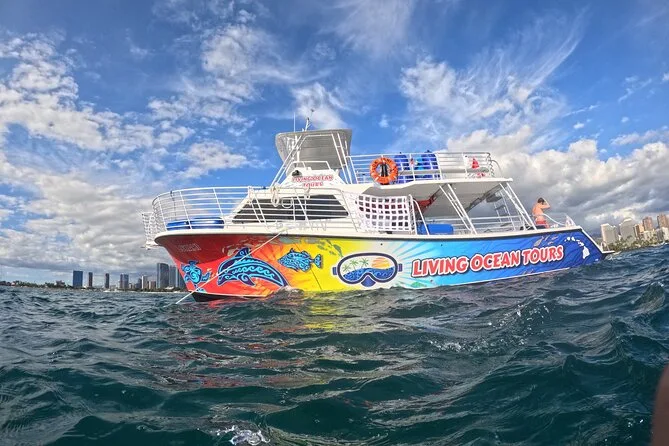 The boat reaches the snorkeling site just off Waikiki after a short cruise from Kewalo Basin.