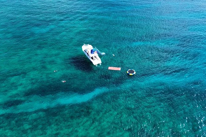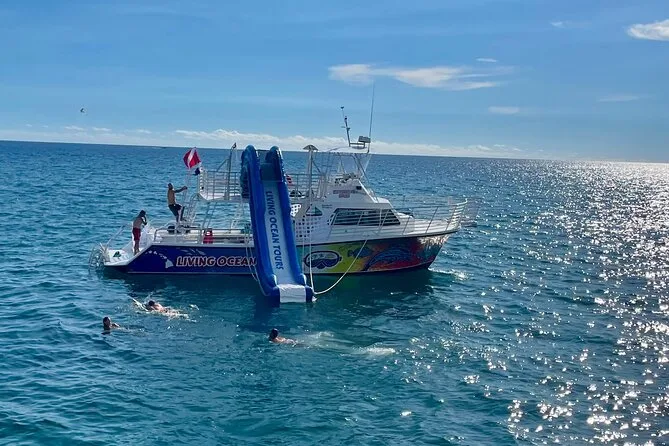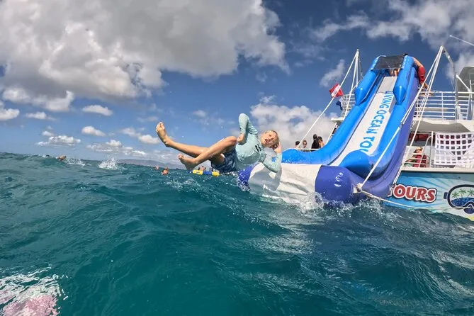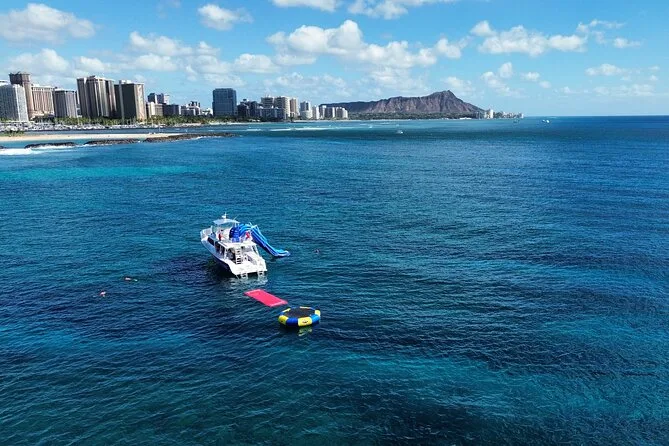 Your day includes pickup at Kewalo Basin harbor, all snorkeling gear and life jackets, access to a two-story waterslide and floating lily pad platform, plus unlimited soft drinks and simple snacks while cruising along Waikiki’s coast toward Diamond Head before heading back ashore together.