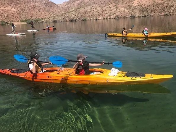 Your day includes a 3-hour guided kayak tour on premium touring kayaks with carbon paddles and full safety equipment; you'll get plenty of snacks (granola bars, fruit, chips) plus bottled spring water along the route; there's also time for wildlife viewing stops and a short hike before returning to Willow Beach Marina together.