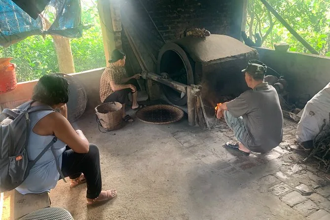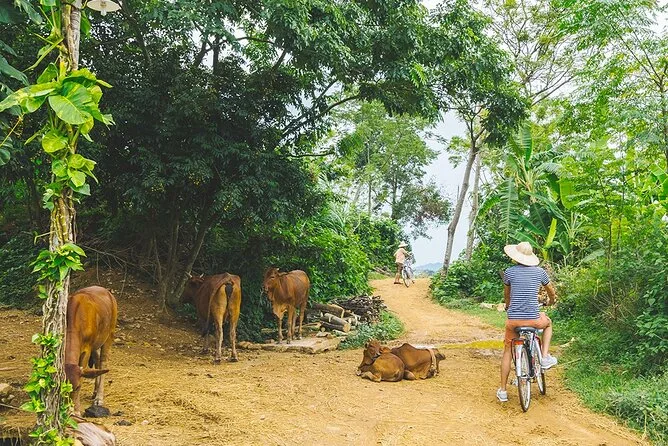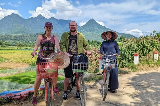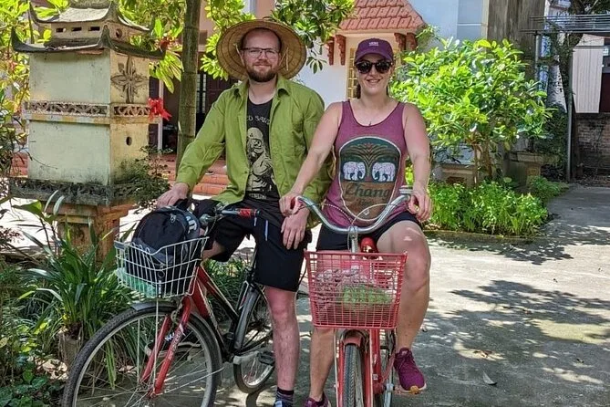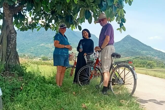 Later, we wandered through the village lanes, stopping at small workshops where locals shaped tofu by hand or wove conical hats from palm leaves. There was this faint smell of rice straw in the air, and kids waved as we passed by on our bikes. The cycling route took us along narrow paths between bright green paddies—one farmer even let us try steering his old bicycle, which squeaked with every turn.
