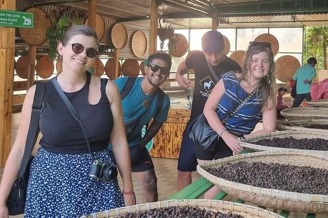 After that, we piled into the van—windows open because the air smelled like wet grass—and headed for Melinh Coffee Garden. The coffee here isn’t just strong; it’s got this wild flavor (they call it “crazy coffee”). I tried to ask about it in Vietnamese and made everyone laugh. We sat looking over rows of coffee plants while Tuan explained how they roast beans right here. The quiet was nice—a few birds, distant motorbikes, nothing else.
