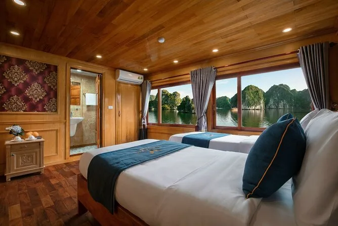 Your two days include hotel pickup from Hanoi Old Quarter, all meals onboard featuring fresh seafood from Lan Ha Bay, kayaking equipment for exploring caves and islets, swimming stops in clear water, a guided biking trip or electric car ride through Viet Hai Village on Cat Ba Island (with visits to homes and schools), plus a cooking class demonstration. Deluxe cabins have air conditioning and private bathrooms; tea, coffee and bottled water are always available in your room before heading back to Hanoi at sunset.