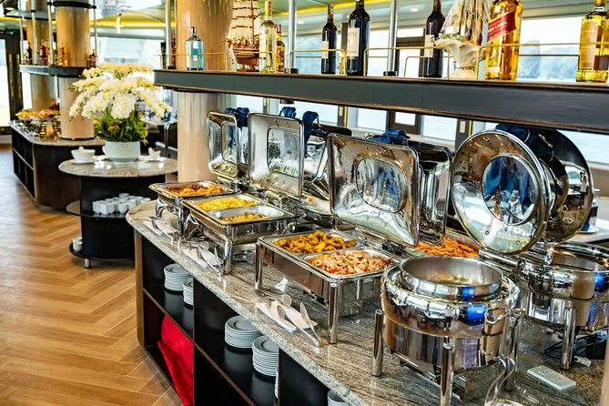 A traditional Vietnamese lunch featuring fresh seafood is served during the cruise.