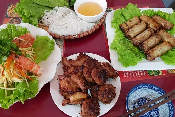 Back at the kitchen, we took a breather while staff rinsed our haul. The room smelled like lemongrass and garlic already. Linh explained each ingredient again—why you use fish sauce instead of soy here, how to slice pork just thin enough for the grill. I went with fried spring rolls, Bun Cha, and Banh Xeo (that crispy pancake). Everyone in the group chose their own three dishes, so there was a lot going on—someone was always flipping something or rolling rice paper.