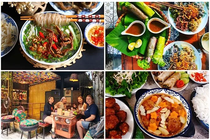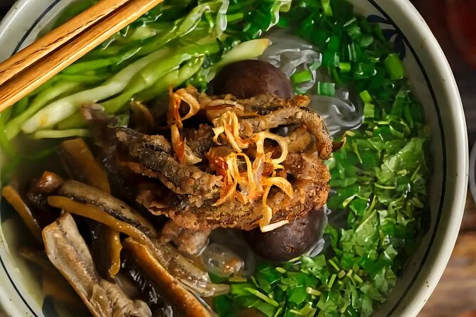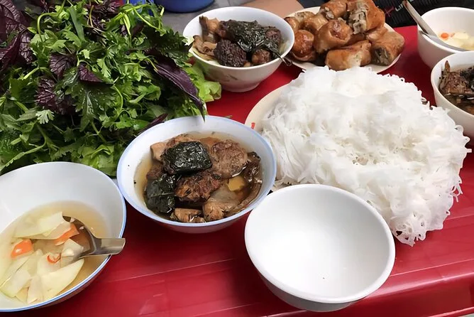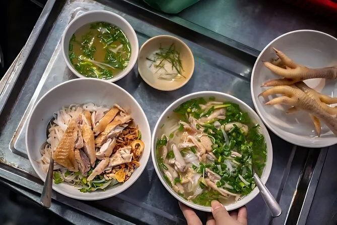 You’ll taste bún chả, phở gà (chicken noodle soup), crispy eel noodles, bánh mì Hanoi, phở cuốn rolls, egg coffee, bia hơi beer, and chè dessert.