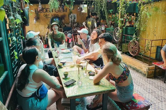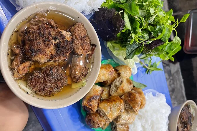 Your evening includes all signature dishes—bún chả grilled pork noodles, chicken noodle soup, crispy eel noodles—as well as bánh mì sandwiches, fresh spring rolls (phở cuốn), creamy egg coffee at Hidden Gem Cafe, local draft bia hơi beer, traditional chè dessert on Train Street plus stories from your English-speaking guide along every stop.