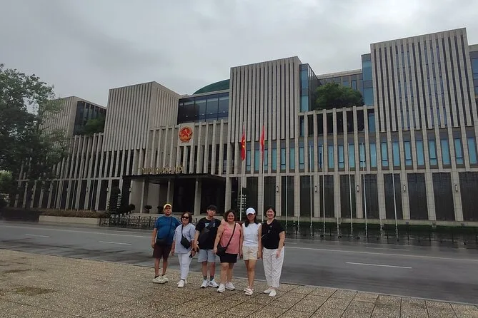 Your day includes hotel pickup by private vehicle at 8:00 AM with an English-speaking guide; all entrance fees covered; stops at major sites like Ho Chi Minh Mausoleum and One Pillar Pagoda; time at a lacquer art workshop; a Vietnamese set menu lunch; cyclo ride through the French quarter; coffee break at train street; water puppet show tickets; then return transfer to your hotel by evening.