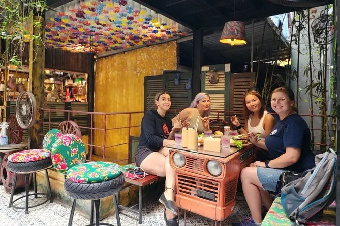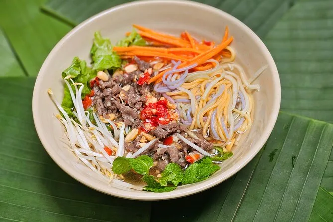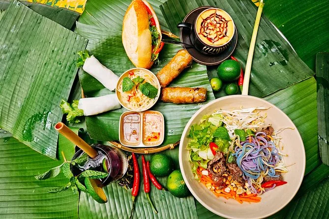 You’ll sample fried spring rolls, fresh spring rolls (Phở Cuốn), Banh Mi, five-colored noodles, green papaya salad, egg coffee, rice wine (moonshine), and fresh beer.