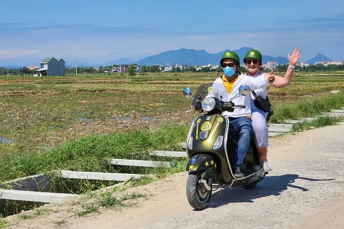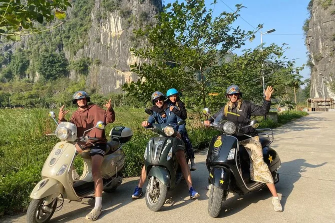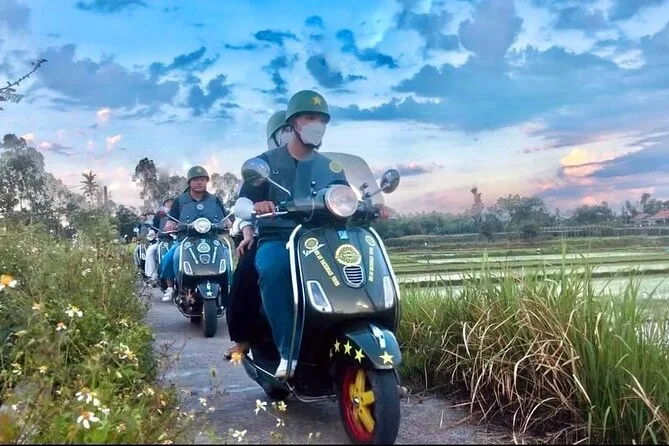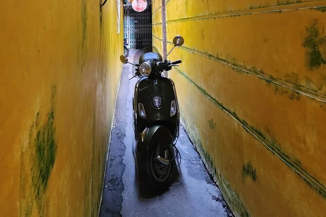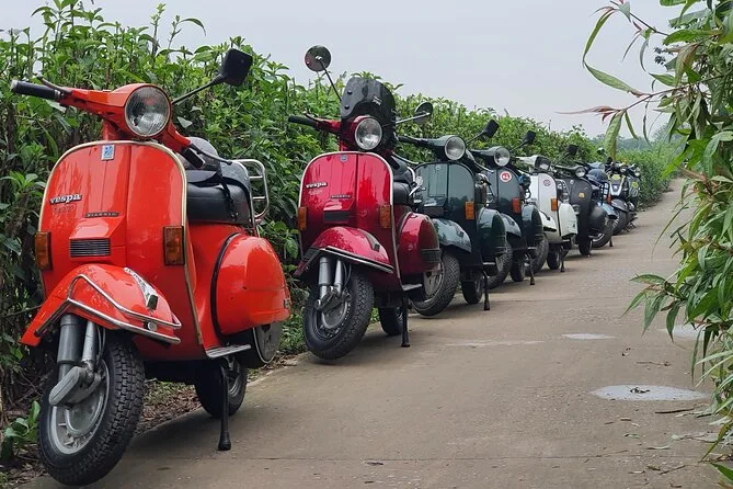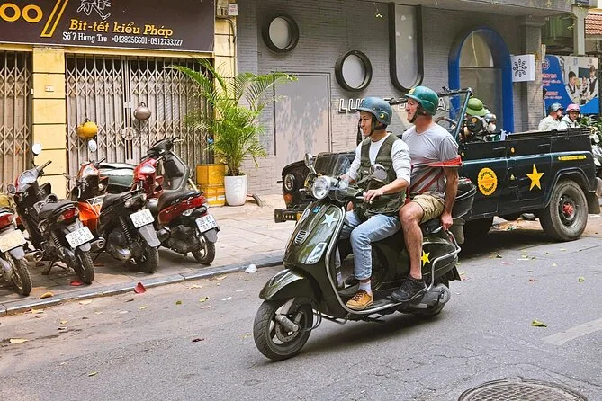 Your day includes pickup and drop-off at your hotel in Hanoi, all authentic local food and drinks (including vegetarian options), bottled water throughout, an English-speaking guide who shares stories as you ride pillion on a classic Vespa driven by an experienced driver—with helmets and rain ponchos provided if needed before heading back after sunset.
