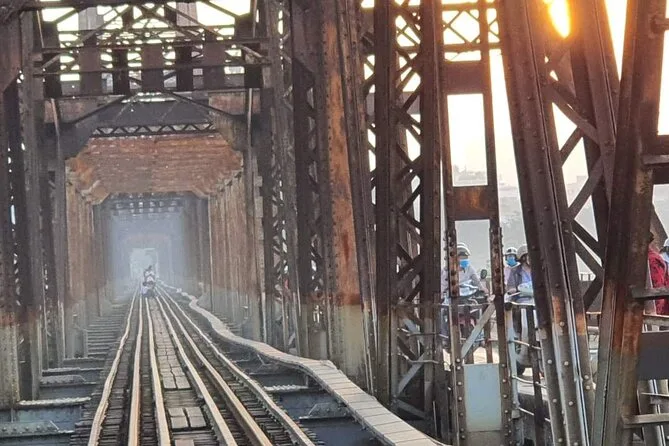 The highlight for me? Probably Train Street. We stopped at this little café right by the tracks—egg coffee in hand—and waited for the train to come barreling through. Everyone got quiet for a second before it roared past so close you could feel it in your chest (I spilled some coffee but nobody cared). Then laughter and chatter again as locals waved from balconies above. After that we crossed Long Bien Bridge—the metal rattled under our wheels—and watched farmers working on tiny plots along the Red River below. Minh told us his grandfather used to walk that bridge every day during the war.