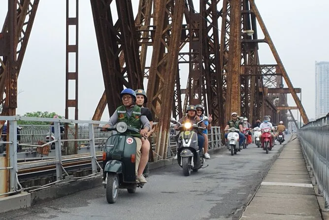 Yes—you’ll cross Long Bien Bridge by Vespa with time for photos and views over the Red River.