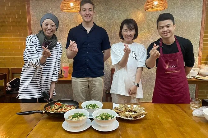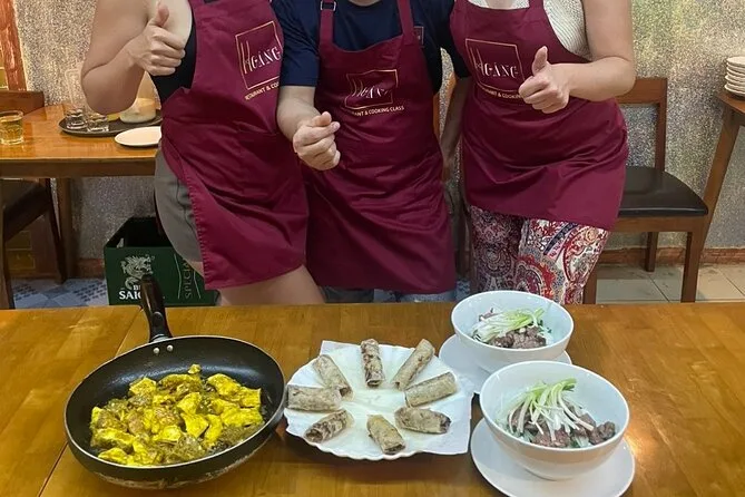 Your day includes choosing three Vietnamese dishes to cook with guidance from both an instructor and chef, all ingredients provided after exploring a local Ho Chi Minh City market together for nearly an hour; enjoy what you make as your meal plus one complimentary drink (beer is fine) and finish off with either egg or coconut coffee before heading out again.