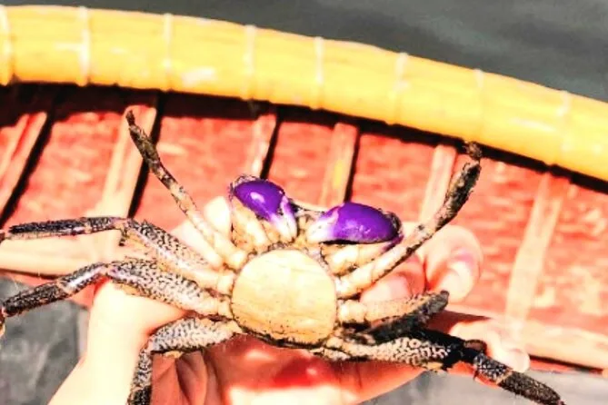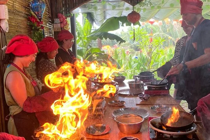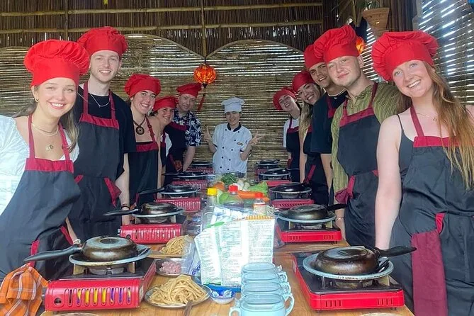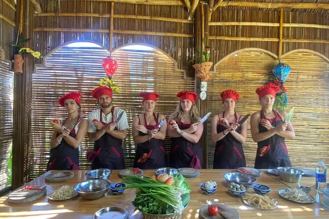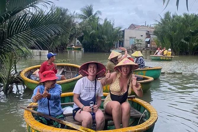 Your day includes hotel pickup and drop-off in Hoi An, all entry fees and tickets for activities in Cam Thanh coconut village, a guided walk through the local market to buy ingredients for your cooking class, a bamboo basket boat ride with crab fishing (life jackets included), hands-on Vietnamese cooking lesson led by Chef Mrs. Tram (with English-speaking guidance), plus lunch or dinner featuring all the dishes you prepare together before heading back to your hotel.