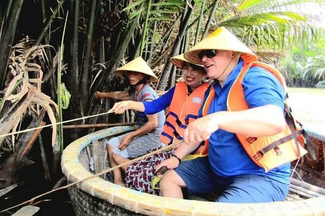 Then we hopped into these round bamboo basket boats in Cam Thanh coconut village. I’d seen photos before but didn’t expect how wobbly they’d feel at first—like sitting in a floating bowl. The canal water was brownish-green under the nipa palms, quiet except for the slap of paddles and someone singing in Vietnamese off in the distance. Our guide showed us how to scoop up tiny crabs from the roots (I only caught one, but it was more fun than it sounds). There was a moment when the sun came through the leaves just right and everything felt slow—I still think about that view sometimes.