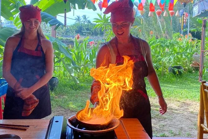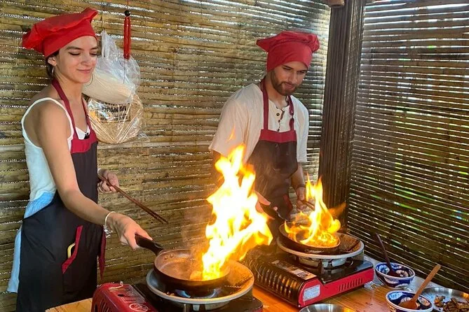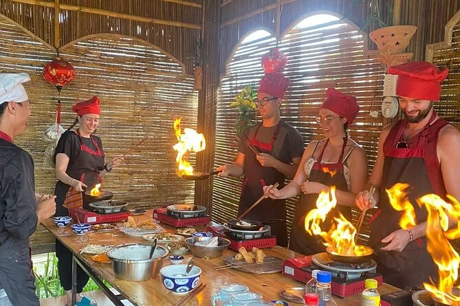 You’ll make banana flower salad, crispy Vietnamese pancakes, deep-fried spring rolls, stir-fried Cao Lau noodles with pork or chicken, stir-fried chicken with lemongrass and chili, plus fresh fruit dessert.