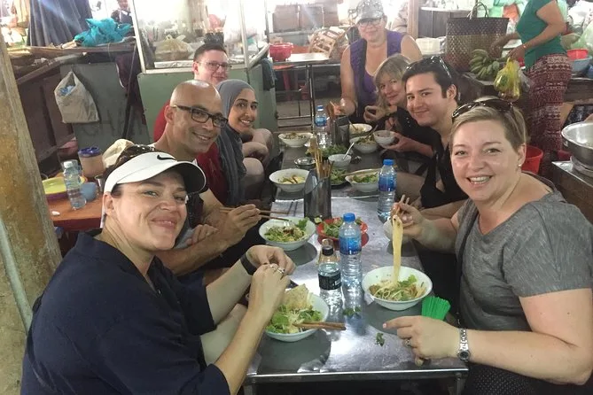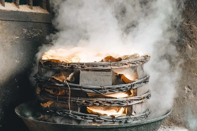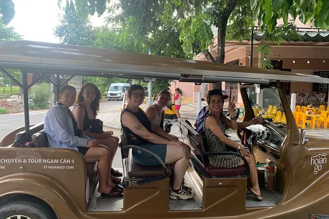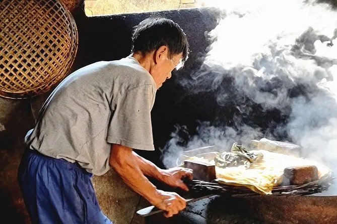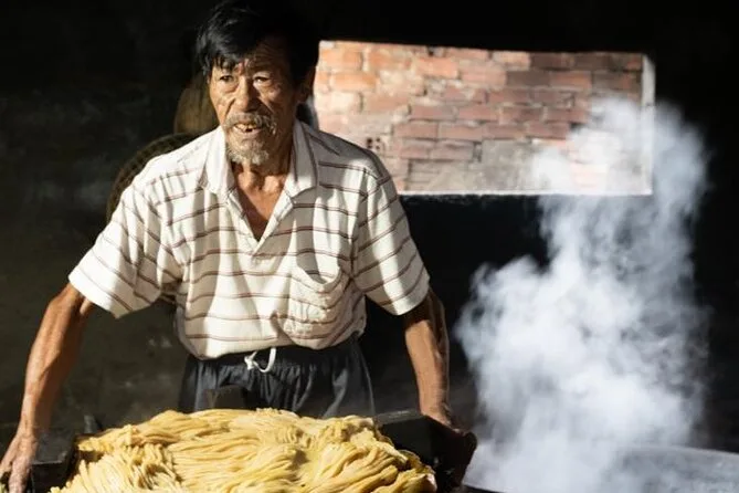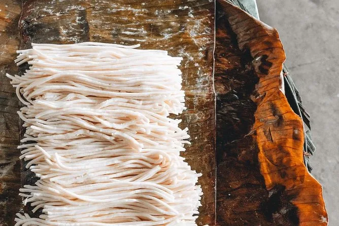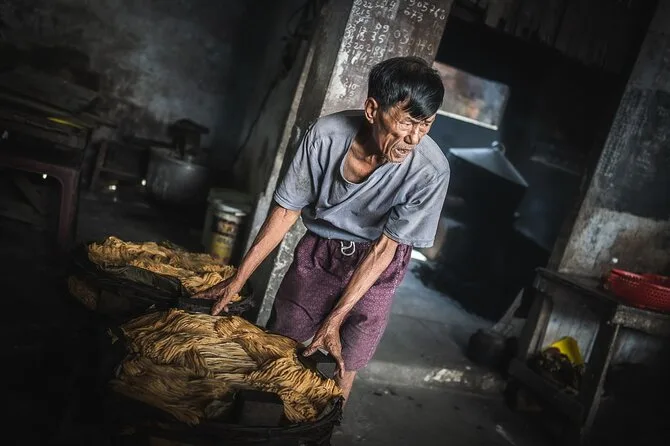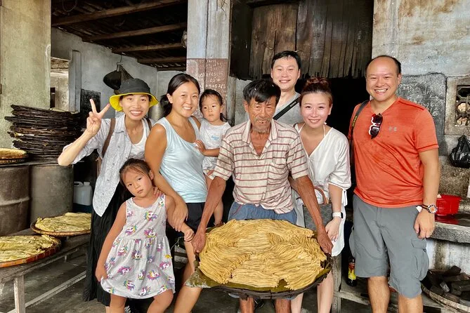 Your day includes pickup by air-conditioned vehicle, bottled water along the way, several tastings of Vietnamese dishes influenced by Chinese and French cuisine (including handmade Cao Lau noodles), plus coffee or tea at a favorite local café before heading back.