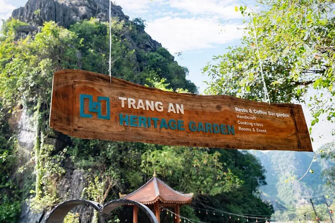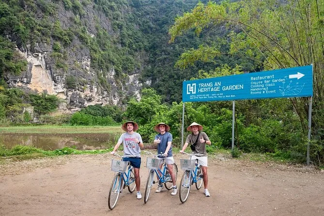 The tour includes Hoa Lu ancient capital, Tam Coc or Trang An boat ride, cycling or relaxing at Trang An Heritage Garden restaurant area, and Mua Cave viewpoint.