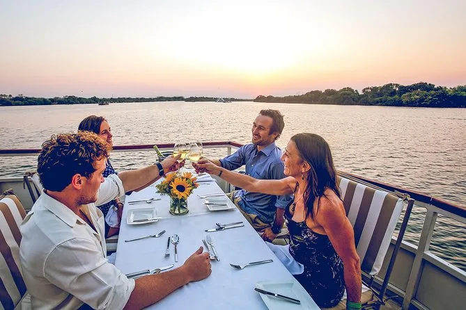 Your evening includes hotel pickup and drop-off from Victoria Falls hotels (Zimbabwe side), all transfers needed to reach the boat, bottled water throughout the journey, a four-course gourmet dinner prepared by an onboard chef using fresh ingredients, plus alcoholic beverages and soft drinks as you drift along the Zambezi River before returning after sunset.